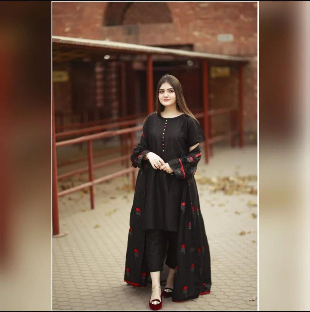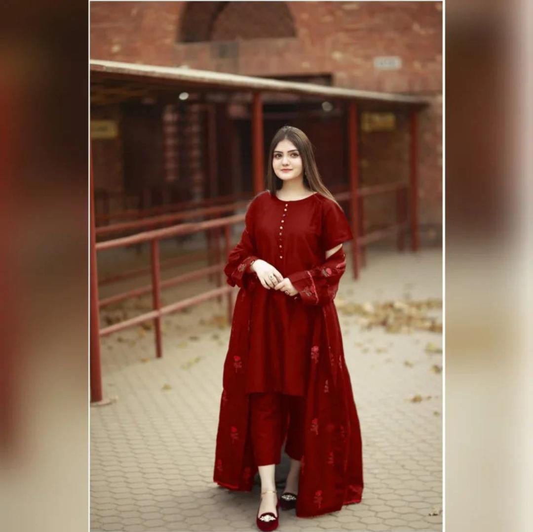 Flower Embroidered GownWith Sleeves Neck Lace 3Pc7 Demanding Colors