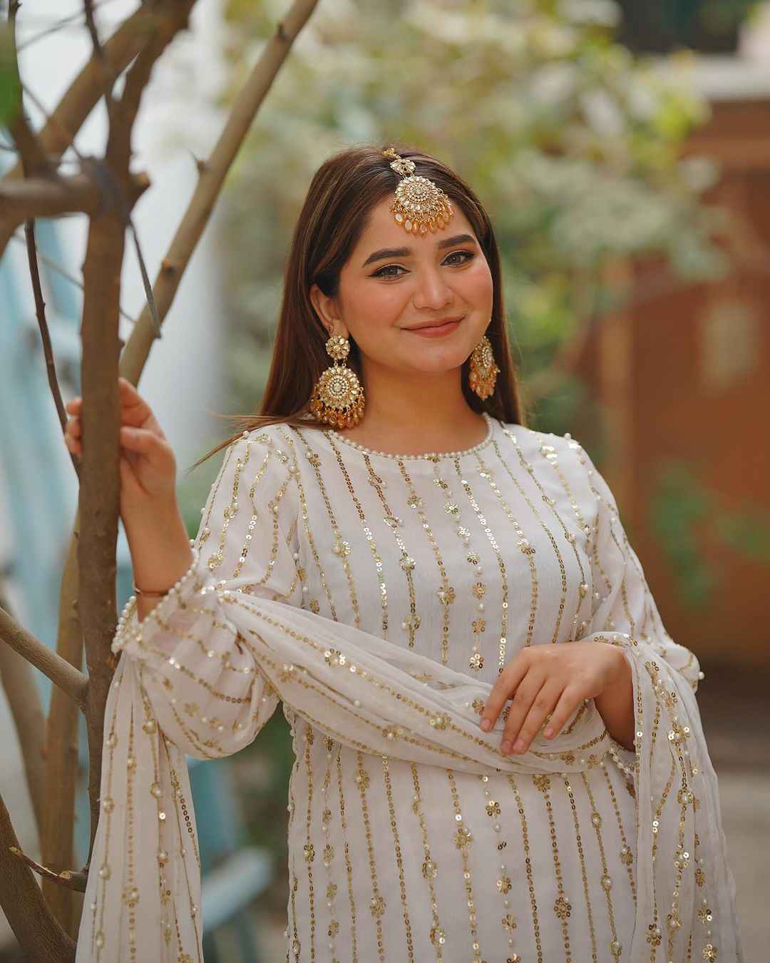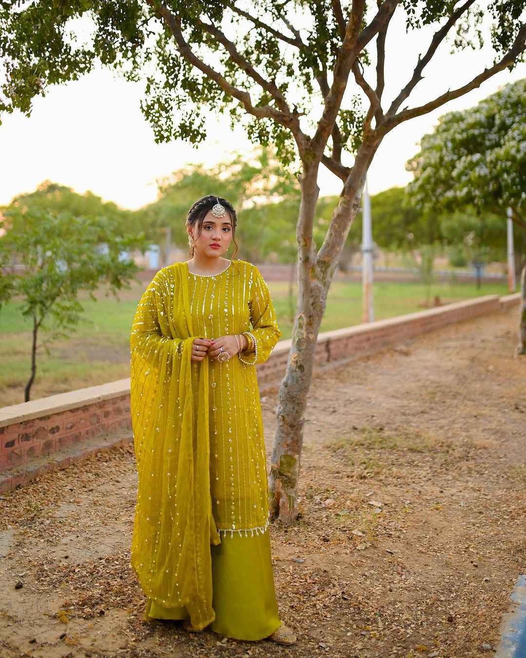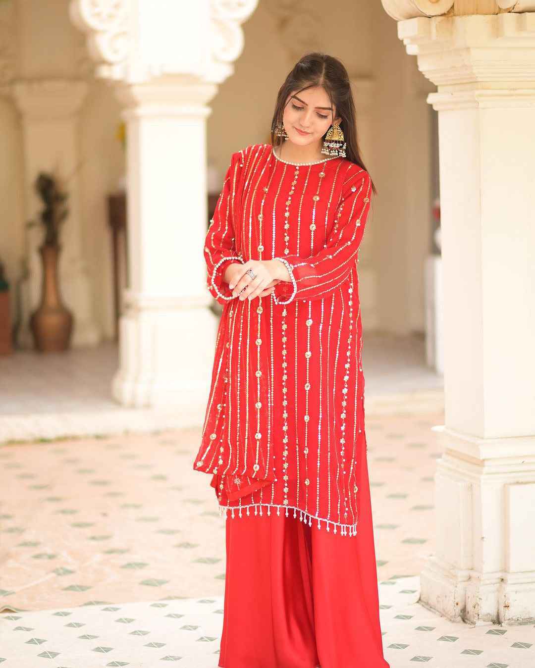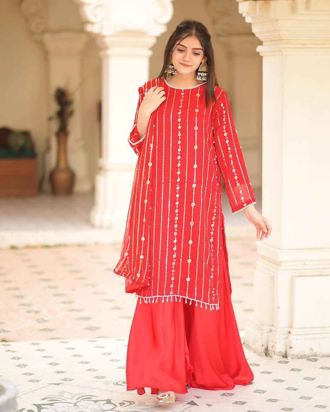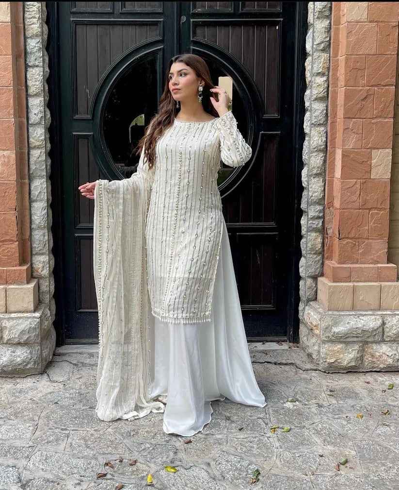 "Front and Back Both Side Sequence Embroidered, with Pearls, Tussels Lace on Daman, Pearls Lace on Sleeves and Neck With Heavy Emb Dupatta 3PCs"😍